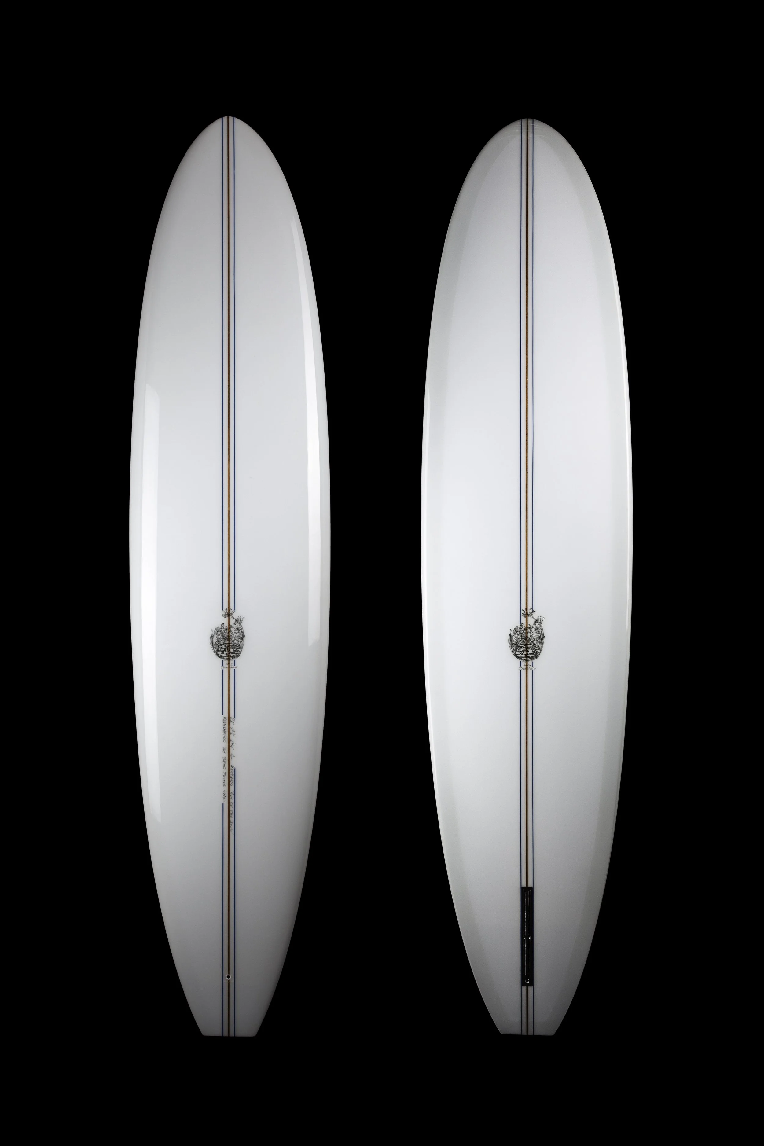 This board was designed and built for the point waves on the north coast. It is 21’ 1/2” wide x 3” thick. The outline is inspired by traditional longboards and the guns of the 50’s and 60’s. It’s components; a roll bottom into spiral V, entry nose rocker is subtle and the tail rocker is cranked with a 90’s style exit out the tail. The Blank is a 8’7 Midget plug, and is glued with a 9mm T Band stringer. The deck is flat and has a 50/50 C rail. The board is refined for speed and has a tucked rail for manoeuvrability.