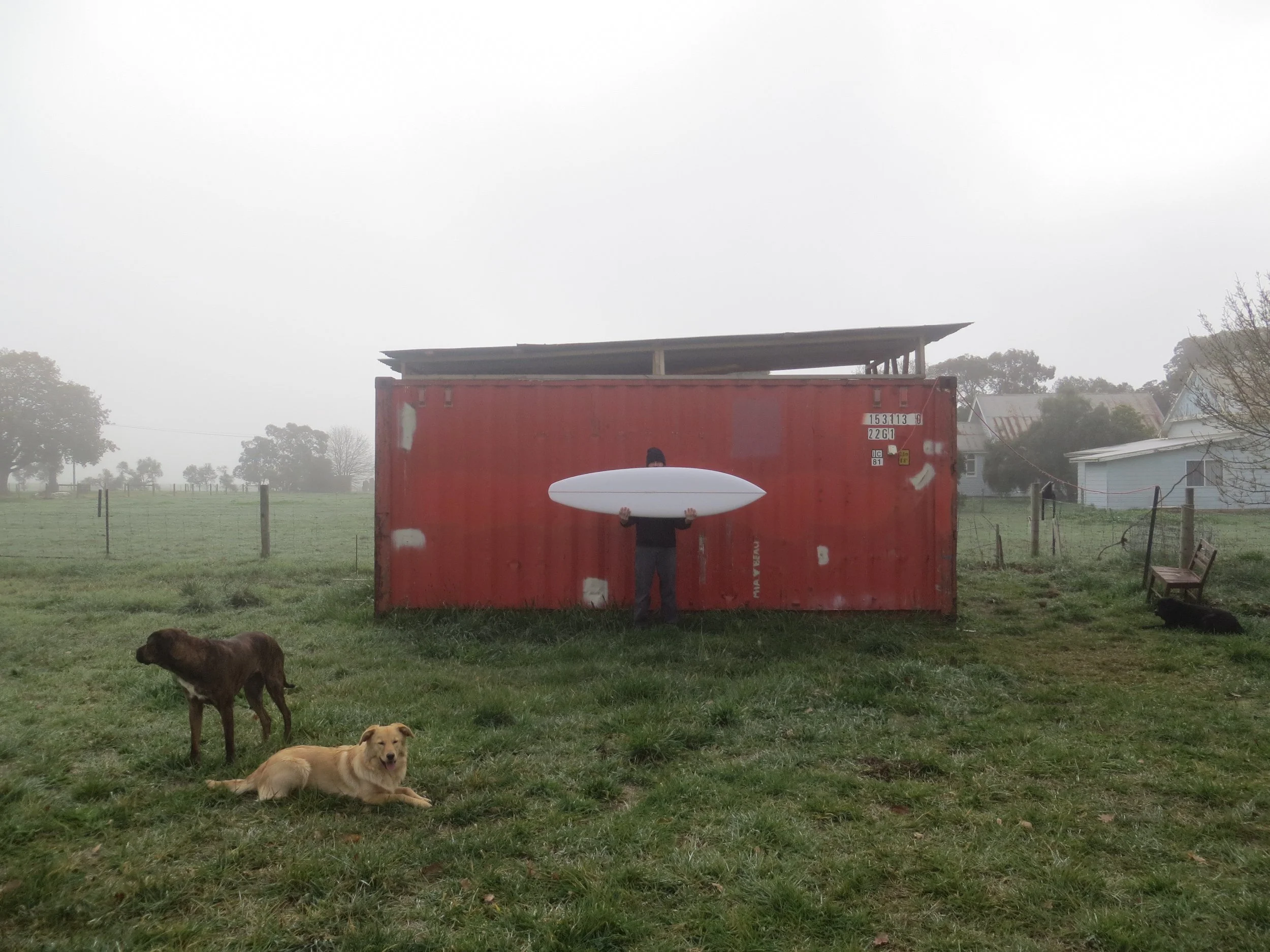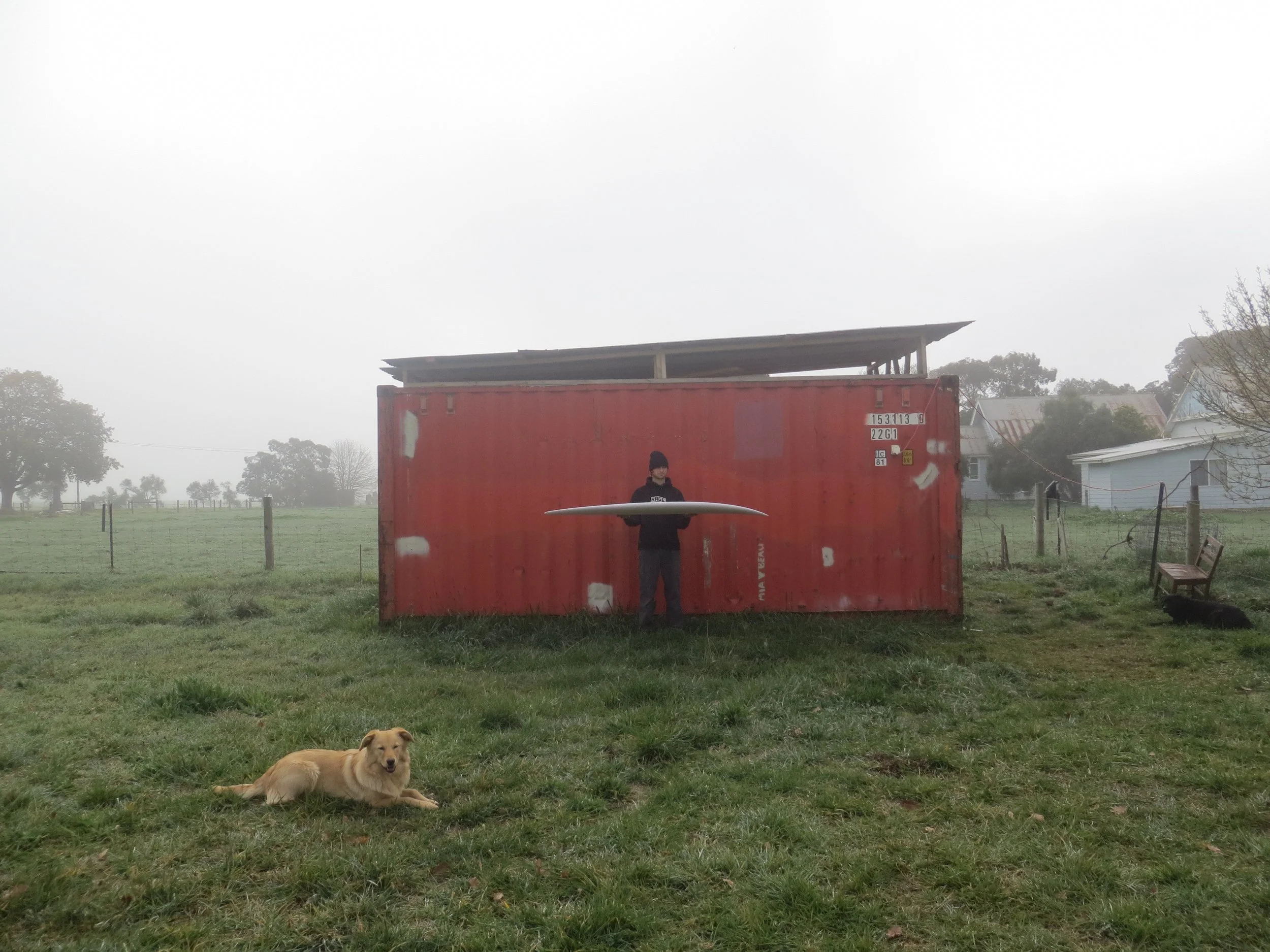 Ellis convinced me to make my own board, he’d offered to help. We were living together on an old farm with a tin shed on the property, it had two rough stands on uneven ground and natural light filtering in the rusted holes. Ellis drew some steps on the wall, left two tools, a surform and a sanding block. Over two days I’d walk down and work on this board, which I came to finish and develop an unknowing interest towards. The shape itself was plain, it was a 5’10” thruster that I had taken measurements from a board I was riding at the time, had a parallel outline, uneven rails, and a gradual rocker with a flat bottom.